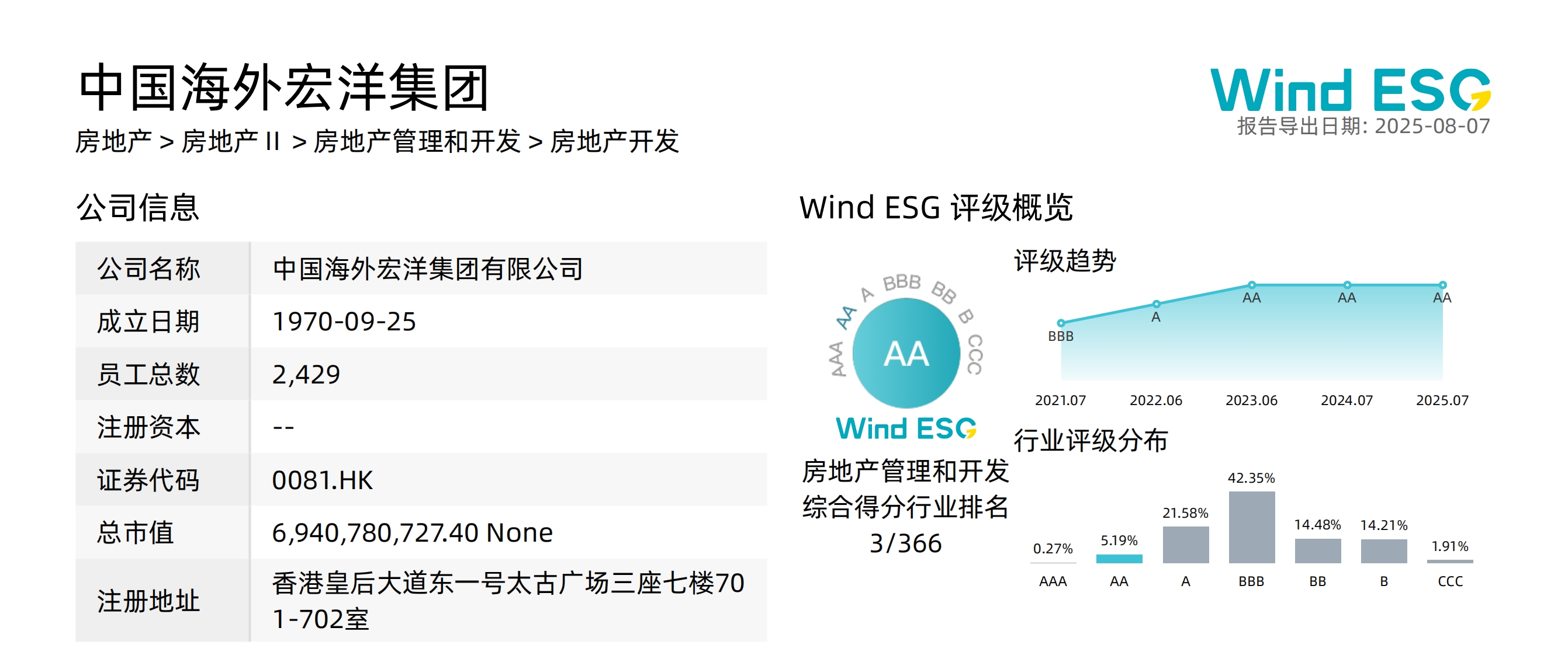 Wind ESG評級的持續提升,印證了中海宏洋深耕ESG領域的顯著成效。公司聚焦環境、社會、治理三大維度精準發力:環境側推進綠色建築、低碳運營,社會側夯實責任治理、權益保障,治理側強化合規透明、多元發展。此次評級排名提升,不僅體現了市場對公司在節能減排、社會責任履行及公司治理等方麵成果的高度認可,更印證了公司以 ESG 為引擎推動高質量發展戰略的有效性。