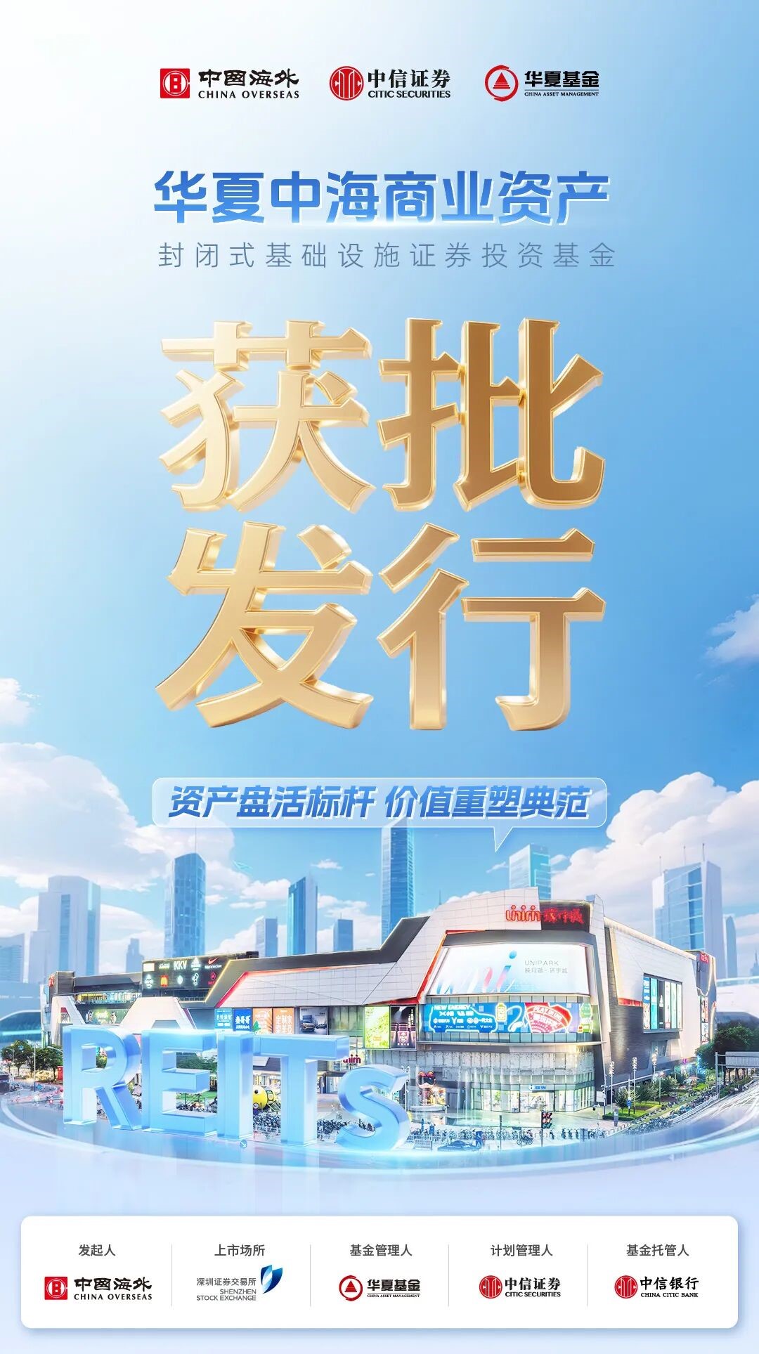 9月23日,由中國海外發展有限公司(股票代碼:00688.HK,以下簡稱“中海”)發起的華夏中海商業REIT正式取得中國證監會準予註冊批復及深圳證券交易所無異議函,在國內消費類基礎設施REITs項目中最快實現“收購-調改-盤活-上市”閉環,標誌著中海資產運營管理又一裏程碑式突破。