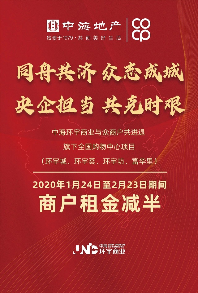 中海環宇商業積極踐行社會責任,展現央企擔當,為減輕環宇商業廣大合作夥伴的經營損失,將對旗下全國購物中心項目(環宇城、環宇薈、環宇坊、富華裡)各品牌商戶,由2020年1月24日至2月23日期間租金減半,與商戶共克時艱。