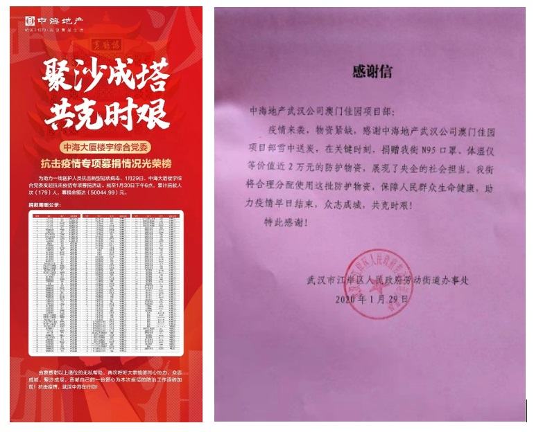 zhonghaidi產wu漢gongsi發qi號zhao,為hubeishengcishan總會kang擊yiqingjuankuan,zhonghaida廈ru駐qi業積極響應,為wu漢yiqingfangkong貢獻綿bozhili,muqianyishoudaojuankuanchao過5.3萬元。此外,武漢中海澳門佳園項目部為所屬街道捐贈口罩、體溫儀等近2萬元防護物資,並收到街道感謝信。