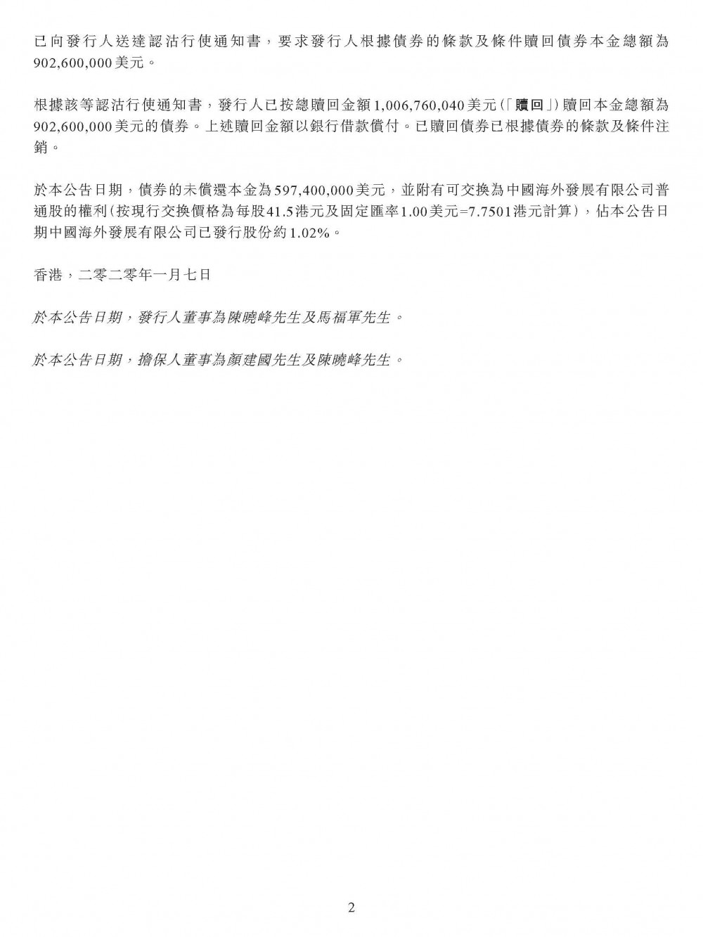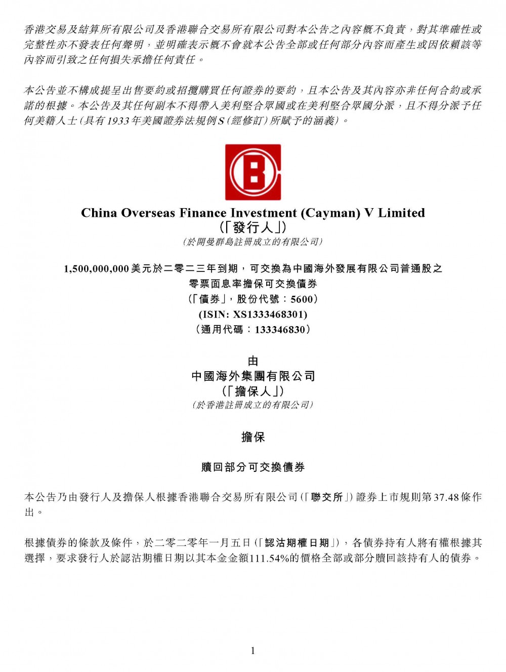 贖回部分可交換債券公告