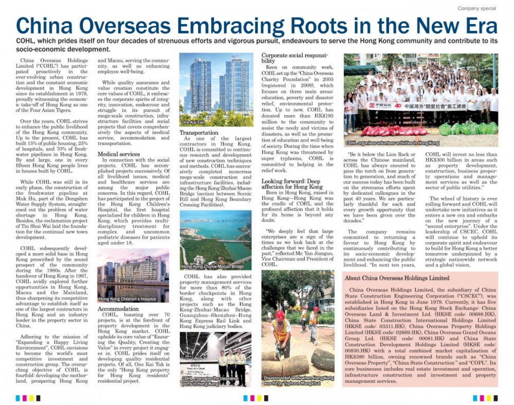 《中國日報》今日以半版刊登中國海外紮根香港、服務香港的企業故事,展現中國海外在樓宇建造、工程建設、不動產開發、物業服務、公用事業等領域,持續為香港經濟與民生的發展貢獻力量。全版如下: