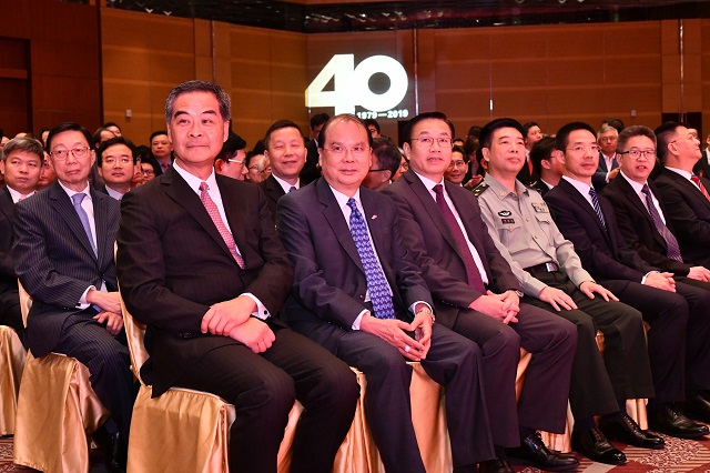香港特別行政區行政長官林鄭月娥在致辭中向中國海外集團成立40周年表示祝賀。她表示,中國海外集團乘著國家改革開放的春風,在香港以祖國資本成立公司,紮根香港40年,作為結合投資、建造、營運和服務於一體的集團,中國海外不僅見證了祖國40年改革開放及香港回歸的光輝歷程,而且積極地參與香港的建設。其中有公共私營的房屋辦公大樓、大型的基建設施,包括港珠澳大橋香港連接、中環灣仔繞道、銅鑼灣隧道,以及醫院、學校、社區設施等,特別是將軍澳消防及救護學院,對香港發展成為今天的國際大都會作出貢獻!