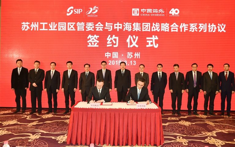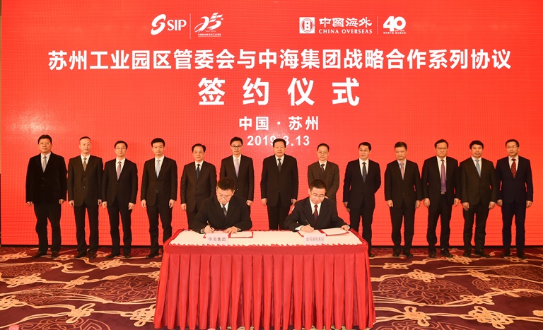 會後,中海集團與蘇州工業園區管委會簽訂戰略合作係列協定,蘇州市委常委、蘇州工業園區書記吳慶文主持簽約儀式。中國建築國際執行董事、行政總裁張海鵬,中國海外發展副總裁齊大鵬、郭光輝分別與蘇州工業園區副書記、管委會主任丁立新,蘇州工業園區金雞湖商務區副書記、管委會主任沈曉明,蘇州恒泰控股集團董事長餘國華代表合作雙方簽署了《蘇州工業園區管理委員會、中國海外集團有限公司戰略合作協定》《蘇州工業園區產業發展協議》以及《蘇州國際財富廣場物業轉讓框架協議》。