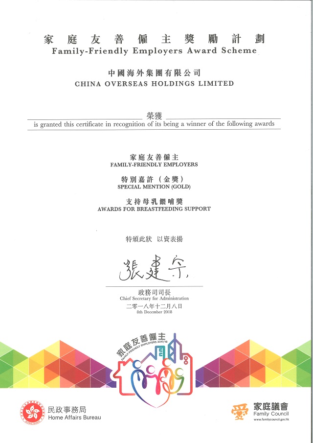 日前,中海集團連續第三屆獲家庭議會嘉許為「家庭友善僱主」(企業組),同時獲頒發「2017/18年度家庭友善僱主」、「2017/18年度特別嘉許(金獎)」及「2017/18年度支持母乳喂哺獎」三個獎項,體現社會公眾對中海集團多年來提倡家庭友善僱傭政策及措施的表現予以充分肯定。