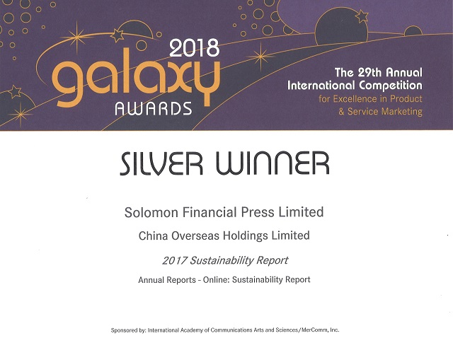 Galaxy Awards 由國際傳訊評選機構MerComm, Inc.zhu辦,jinnian為diershijiu屆舉xing,zhizai發jue並biao揚shijiegedizhan現feifan創yihexinxi傳bojiqiaodechusegong關傳訊fangan。評審團you來zishijiegedidegong關傳訊專業ren員組cheng,對參選dezuopinzaigainian創yi、成效、整體訊息傳遞方式等方麵進行評審。各類別均設金、銀、銅及優異獎各一名,若沒有參選作品符合評審準則,有關獎項將會懸空。今年中國海外集團獲得「線上年報—可持續發展報告類別」銀獎(本年度金獎懸空)。