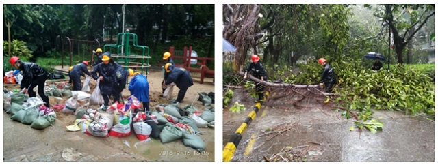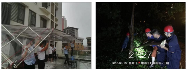 中海物業統籌組織港澳、廣東、廣西地區的下屬11家公司、288個在管專案及6852名工作人員及於9月15日前完成了應對颱風的人員與物資器材的準備,有效做到了最大程度的降損止損;在颱風到來之時,物業人員全員待命,保持通訊暢通,及時匯報防風進展,每日出動約7000人的力量鋪排在項目現場處置颱風“山竹”帶來的不利影響,迅速應對各類險情,保障了在險情出現時的迅速回應。在經歷了“應對颱風的準備”與“迎接颱風的挑戰”後,中海集團這群“最可愛的人”又立刻投入到了相關城市的救災恢復當中。