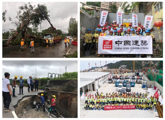 9月17日上午,中建國際在港澳地區迅速集合參與外部搶險救災隊伍近500人,大型運輸車輛及機械一百餘部,小型電、手動工具3,000餘件,做好隨時配合中海集團和特區政府有關部門風後救災工作的準備。事實證明這樣的準備十分及時,當天先後有香港路政署、將軍澳警署、大埔荔枝山村民、澳門民政總署等政府部門、團體向中國建築請求支援。港澳地區專案在自救的同時,盡一切條件配合外部救災,並嚴格按照公司“以人為本,勇於擔當,服務香港”的要求紮紮實實地開展搶險救災工作。截至9月17日21點,搶險團隊共清除樹木約50餘棵,清理道路約15公裏,清理公共區域麵積數平方公裏,贏得了特區政府有關部門、本地社團的高度讚揚。