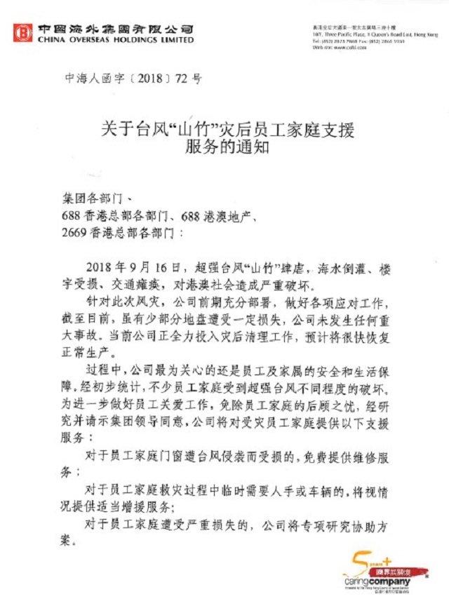 麵對此次超強颱風,中海集團無人員傷亡,無重大事故,準確的預警、充分的準備、頑強的抗擊和及時的援助都證明了我們的工作是卓有成效的。救災行動刻不容緩、義不容辭,中海集團將繼續積極參與社會救災行動,始終與您同在。