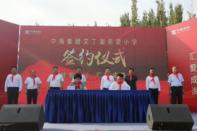 2018年9月4日(ri)上(shang)午(wu),中(zhong)海(hai)集(ji)團(團)艾(ai)丁(ding)湖(hu)希(xi)望(wang)小(xiao)學(學)捐(juan)建(jian)簽(簽)約(約)暨(ji)奠(dian)基(ji)儀(儀)式(shi)在(zai)吐(tu)魯(魯)番(fan)市(shi)高(gao)昌(chang)區(區)恰(qia)特(te)卡(ka)勒(le)鄉(鄉)舉(舉)行(xing)。吐(tu)魯(魯)番(fan)市(shi)委(wei)書(書)記(記)張(張)文(wen)勝(勝),中(zhong)海(hai)集(ji)團(團)董(dong)事(shi)長(長)周(zhou)勇(yong)出(chu)席(xi)並(並)致(zhi)辭(辭)。吐(tu)魯(魯)番(fan)市(shi)委(wei)常(chang)委(wei)、教工委書記王業欽,中海集團助理總經理劉為民,中海地產副總裁郭勇,中海地產新疆公司總經理孫浩,吐魯番市人民政府、市人大、政協、教工委、教育局、高昌區的相關領導出席活動。