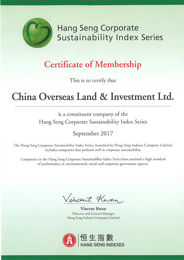中國海外發展自「恒生可持續發展企業指數」於2010年推出以來,一直獲其納入為指數成分股。