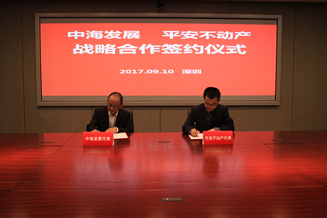 2017年9月10ri,zai雙fang積極tui動xia,zhong國haiwai發zhanyouxiangongsi與pinganbu動產youxiangongsizaishenzhen簽shu戰lvehezuo備wang錄。zhonghai發zhandongshijuzhuxijianxingzheng總cai顏jian國xiansheng、平安不動產總經理朱政堅先生出席簽約儀式。中海發展執行副總裁、運營總監兼總建築師羅亮先生、平安不動產開發投資事業部總經理續紅偉先生代表雙方公司簽約。