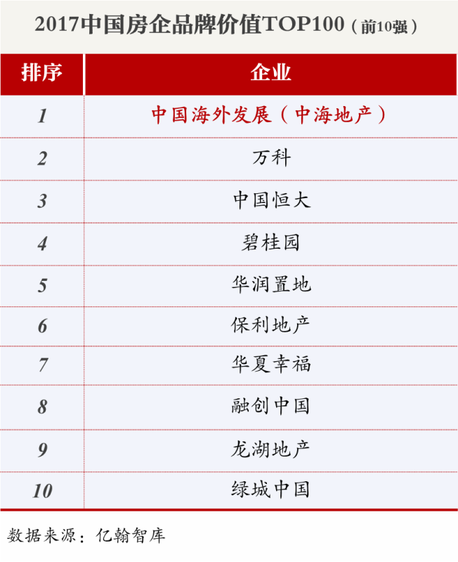2017中國房企品牌價值TOP100榜單: