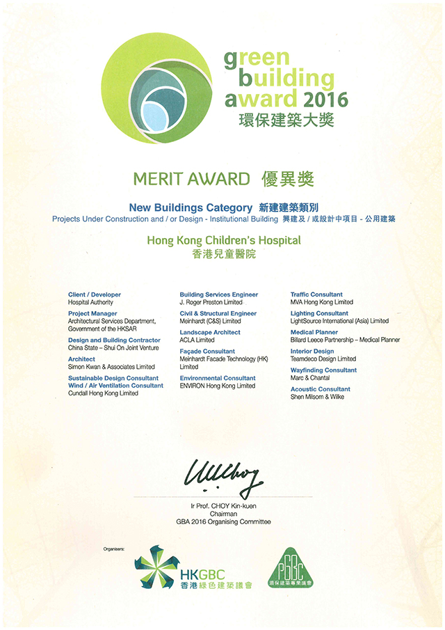 中國建築國際香港兒童醫院項目榮獲香港環保建築大獎2016之新建築類別優異獎