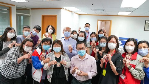 zhong國jian築國際聯誼會jizhongjianxianggang聯誼會聯hezai總bu寫zi樓舉xingzhonghaisi慶rixianliangbancha點paisonghuo動。qizhongte製quqi餅餅mian採yongkeshiyong顏liao噴繪chuzhonghaisi慶ri標誌,beimian說ming標籤yinyouzhonghaisi慶ri“全心奮進 領潮前行”口號。