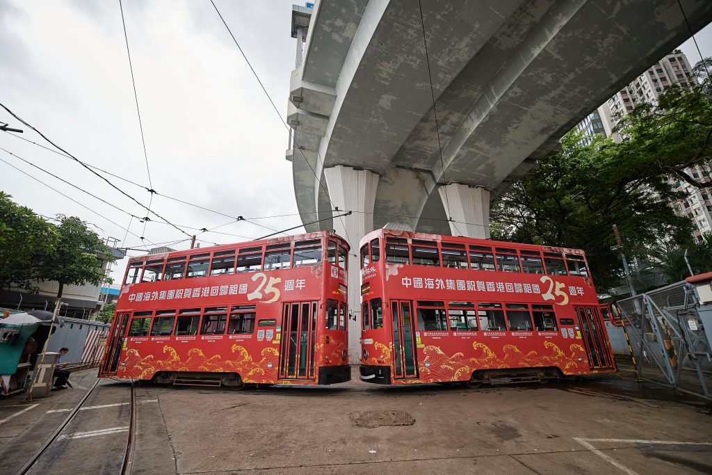 慶賀香港回歸祖國25周年的電車廣告採用紅色為主色,寓意祖國繁榮;底部金色的浪潮代表中國海外集團的「領潮」文化,象徵著集團不斷超越、引領趨勢、勇立潮頭。目前,5架印上慶賀廣告的電車已正式運行。
