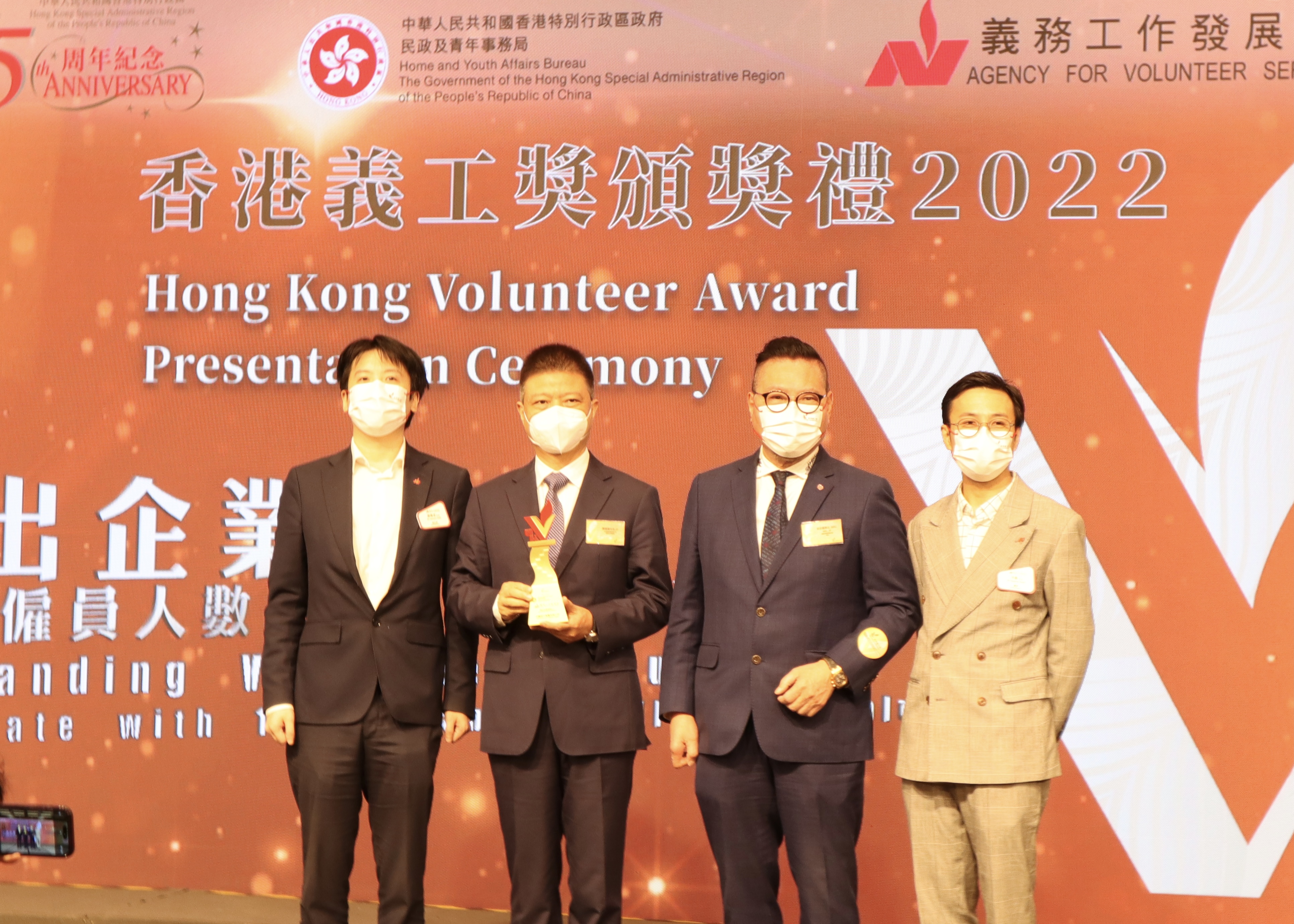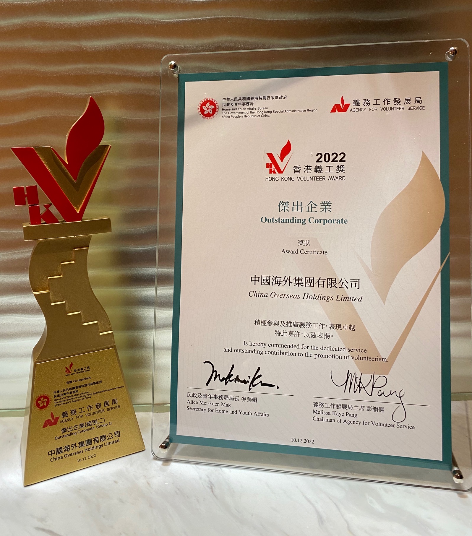(2022 年 12 月 10 日)中國海外集團有限公司(下稱「中國海外集團」或「集團」)憑藉出色的義務工作表現,榮獲「香港義工獎 2022-傑出企業」獎,集團旗下中海物業集團有限公司同獲「年度十大最高義工時數」獎。頒獎典禮於今天在香港會議展覽中心順利舉行,香港特區政府政務司司長陳國基出席頒獎典禮,中國海外集團董事長、總經理顏建國出席頒獎典禮並上台領獎。