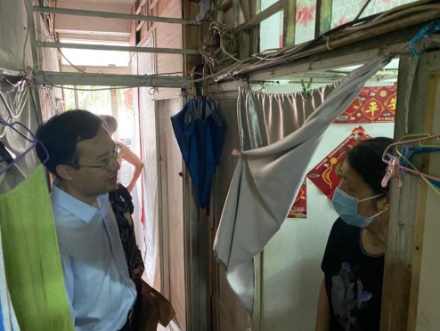 馬福軍(左)與荃灣區居民親切交流,並探訪附近劏房戶和基層家庭,了解他們的生活環境及困難,並主動建議為劏房戶加裝風扇。