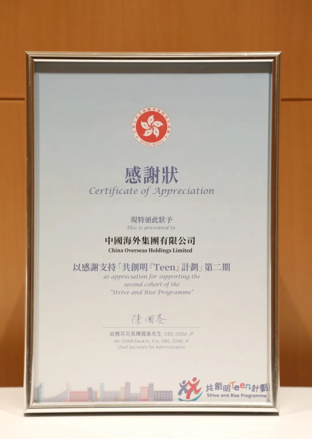 近日,“共創明‘Teen’計劃”第(di)二(er)屆(屆)合(he)作(zuo)夥(huo)伴(ban)委(wei)員(員)會(會)舉(舉)行(xing)首(shou)次(ci)會(會)議(議),香(xiang)港(gang)特(te)區(區)政(zheng)府(fu)政(zheng)務(務)司(si)司(si)長(長)陳(陳)國(國)基(ji)主(zhu)持(chi)會(會)議(議)。中(zhong)海(hai)集(ji)團(團)再(zai)度(du)成(cheng)為(為)新(xin)一(yi)屆(屆)合(he)作(zuo)夥(huo)伴(ban)委(wei)員(員)會(會)的(de)策(ce)略(lve)夥(huo)伴(ban),受(shou)邀(yao)參(參)加(jia)會(會)議(議)並(並)獲(獲)頒(頒)感(gan)謝(謝)狀(狀)。