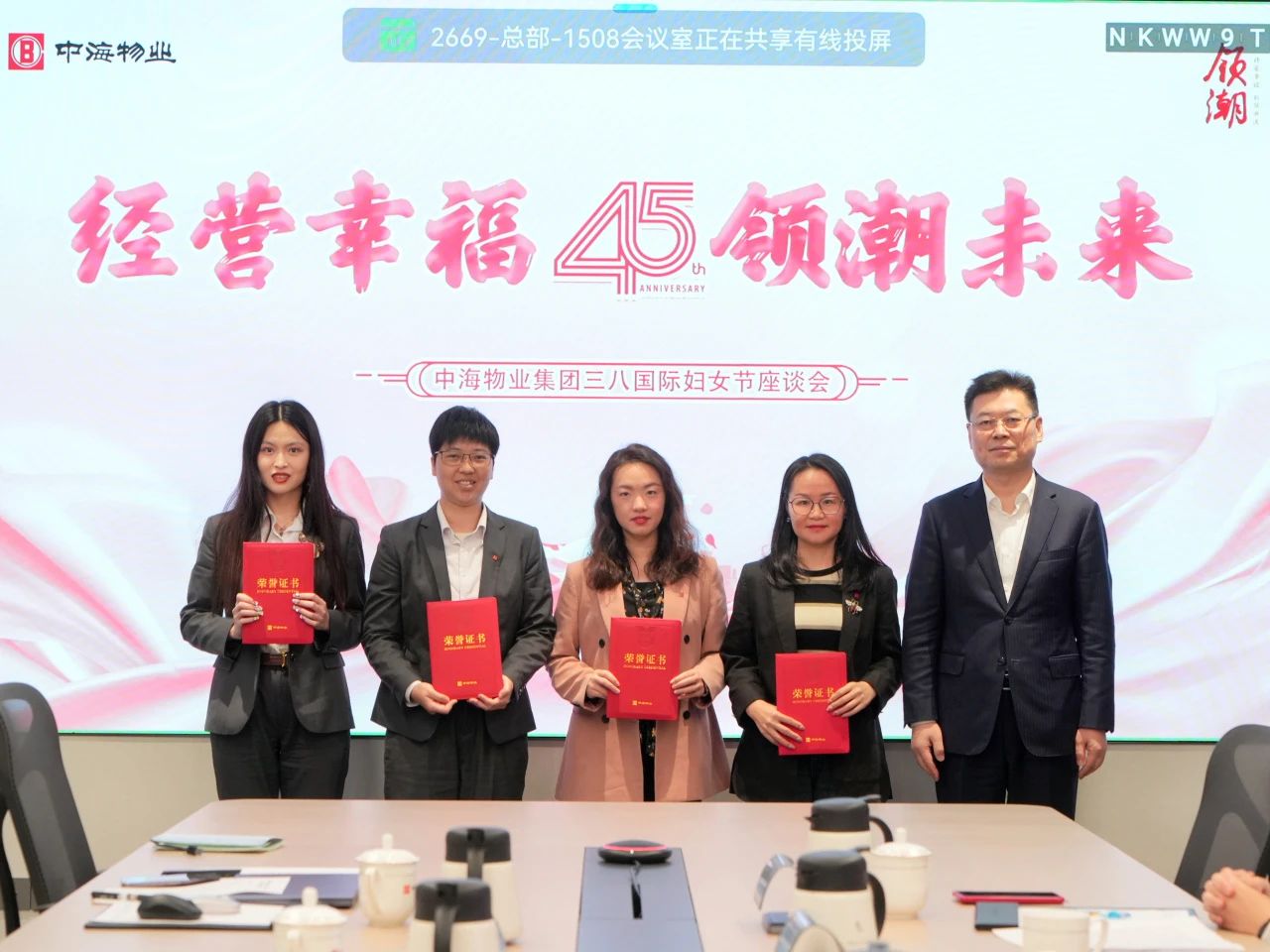 中海物業總部組織開展“經營幸福 領潮未來”三八國際婦女節座談會,中海集團董事、中海物業董事局主席張貴清出席會議,親切慰問中海物業歷年“巾幗建功標兵”代表,並為榮獲2023年度“巾幗建功標兵”代表頒發榮譽證書。