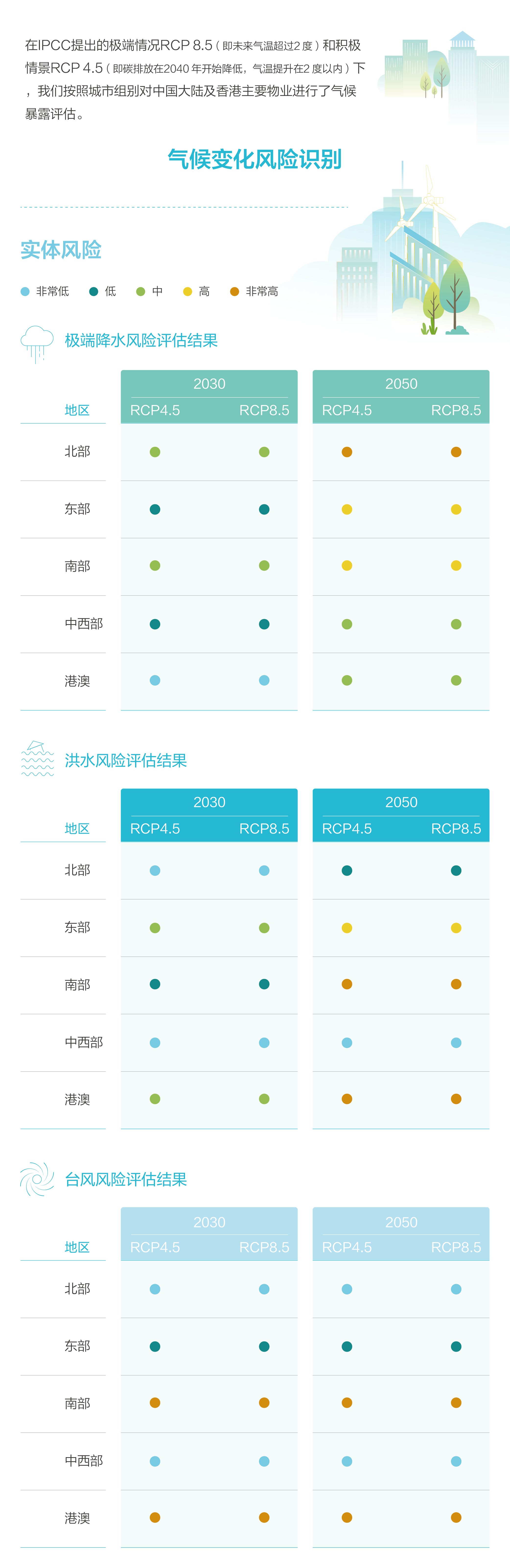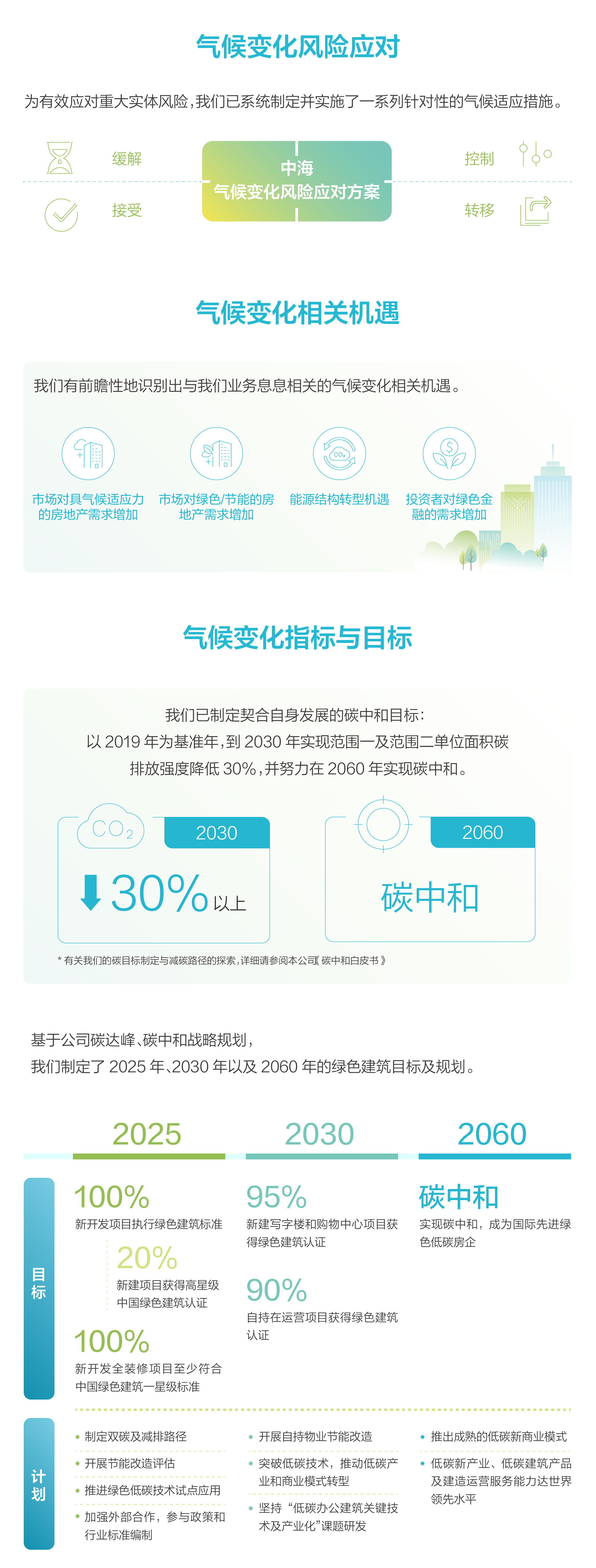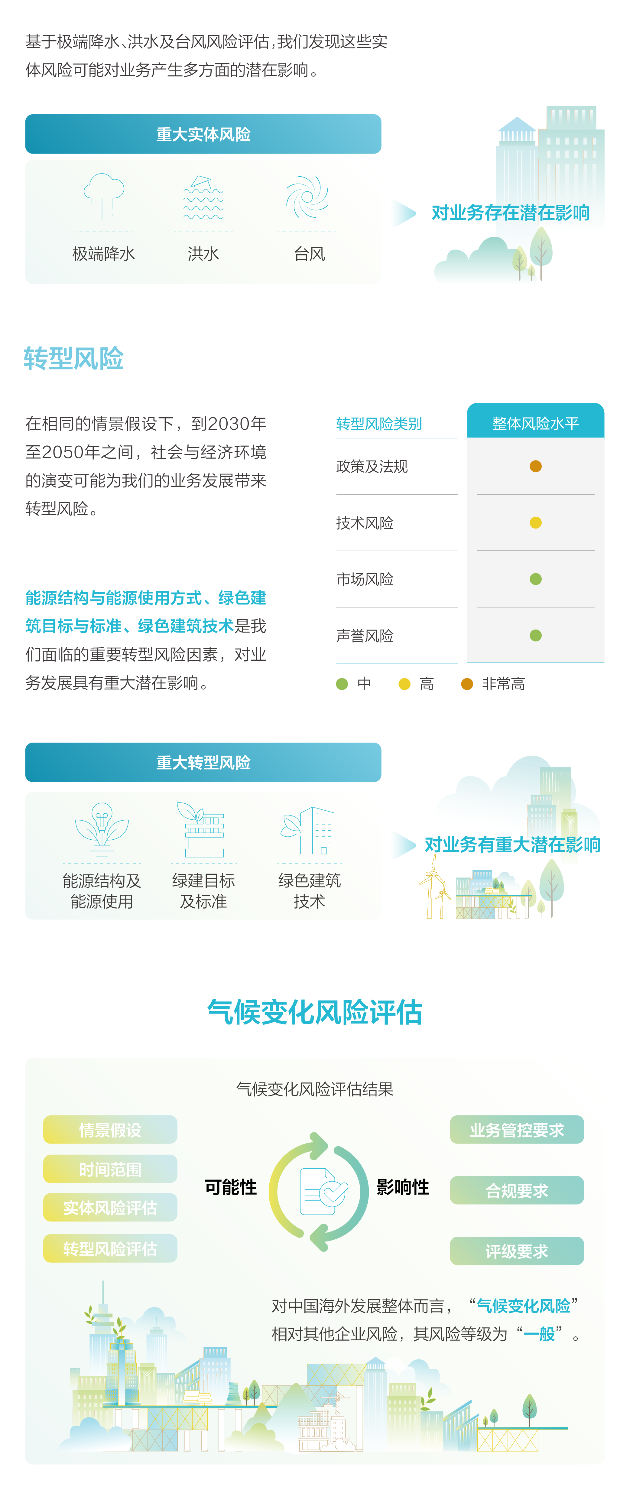 從2020年起,中國海外發展依據氣候相關財務資訊披露工作組(TCFD)的建議框架,圍繞「治理」「策略」「風險管理」以及「指標和目標」四大核心支柱,係統構建氣候風險管理機製,以專業行動積極應對全球氣候挑戰。公司持續跟蹤國際氣候披露準則、全球市場趨勢及本地監管要求,定期評估氣候變化管理成效。通過「三道防線」機製監測和協調風險管理,並開展氣候變化情景分析,識別實體風險與轉型風險,評估其對業務的潛在影響,進而製定涵蓋緩解、控製、轉移及接受四類策略的氣候適應措施。