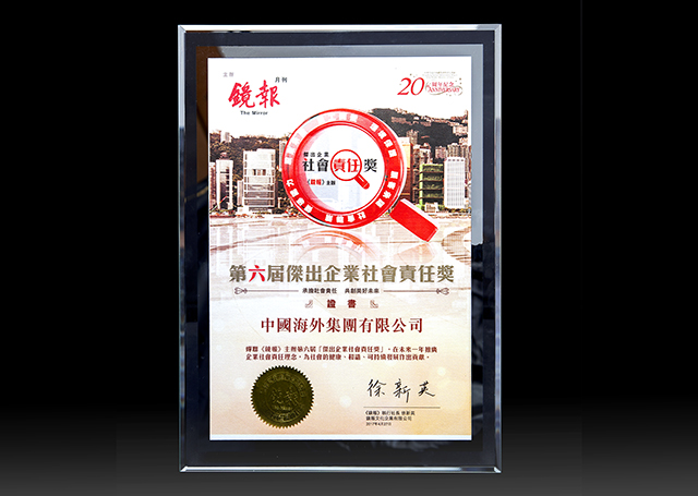 (2017年4月27日)中國海外集團有限公司(以下簡稱「中國海外集團」或「集團」)於《鏡報》月刊主辦的「第六屆傑出企業社會責任獎」評選活動中,連續第三年獲頒發「傑出企業社會責任獎」,以表揚集團過去一年在員工關愛、環境保護、股東承擔、領導能力、顧客承諾以及社會聯繫等企業社會責任範疇之貢獻及努力,並積極實踐企業的可持續發展。
