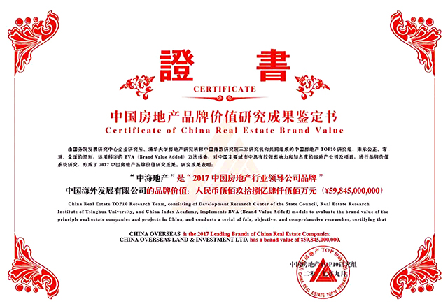 In the China Real Estate Brand Value Evaluation conducted by industry authoritative organizations such as China Real Estate Association and China Index Academy, China Overseas Land & Investment ranked first in the industry again.
