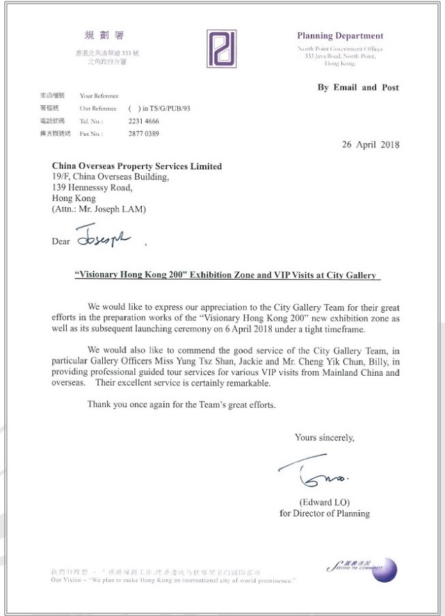 China Overseas Property Group attaches great importance to the deployment in advance to make the visit process and the operation of the exhibition hall smooth. After the visit, Huang Weilun, the director of the Development Bureau who accompanied the visit, told the media reporters that Committee member Qiao Xiaoyang was very interested in the items explained during the visit and thought that the introduction was very informative. At the same time, he reported to China Overseas Property, which is in charge of the reception work. The staff of Zhancheng Pavilion would like to express their gratitude. The Planning Department also sent a letter of appreciation to China Overseas Property for its professional services during this visit.