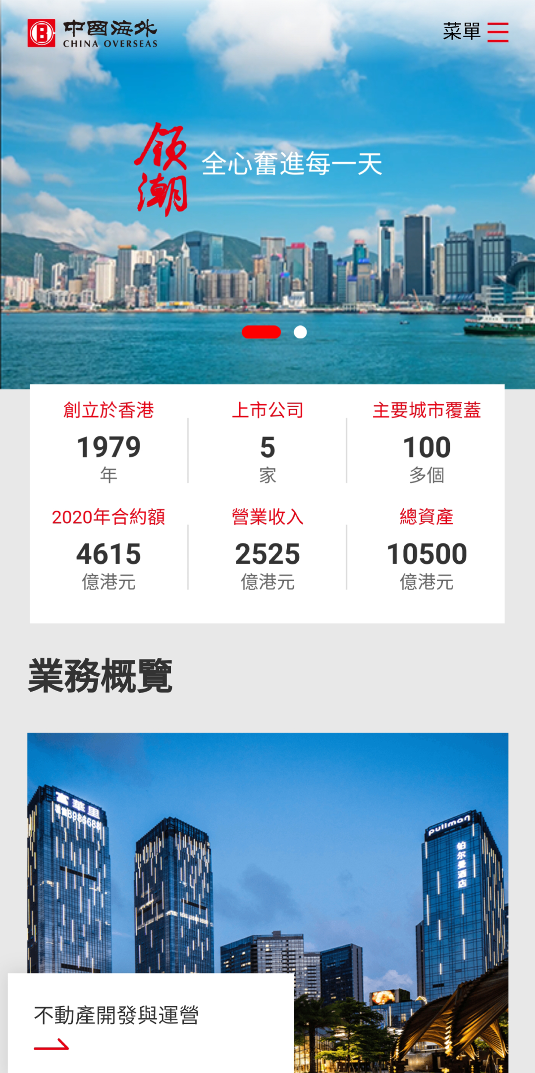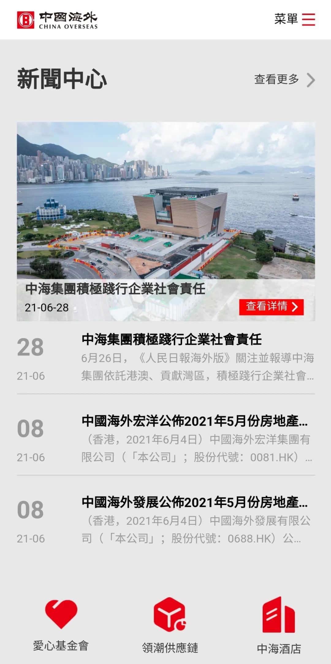 25 June 2021, China Overseas Holdings Limited is delighted to officially announce the launch of our newly revamped website, which based on the "Leading Culture"and refined the content and category for a user-friendly browsing experience for our valuable partners, showcasing our excellent development and leading to the world-class corporate image.