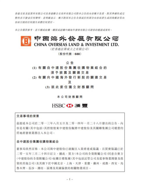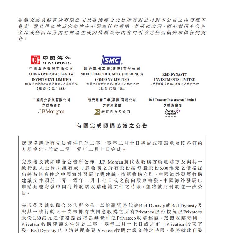 3月,中國海外發展完成對蜆殼電器工業(集團)有限公司(股票代碼:00081)的收購,後者更名為中國海外宏洋集團有限公司。
