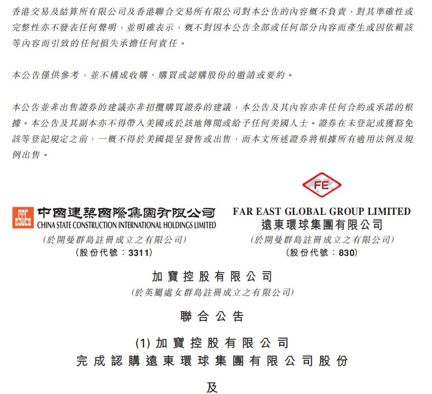 2月,中國建築國際全麵要約收購遠東環球集團有限公司(股票代碼:00830)。目前已更名為中國建築興業集團有限公司。