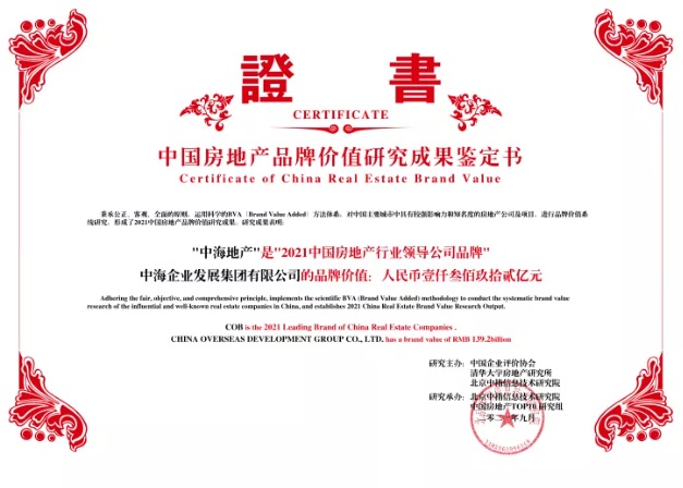 9月15日,由中國企業評價協會、清華大學房地產研究所、北京中指信息技術研究院主辦,北京中指信息技術研究院中國房地產TOP10研究組承辦的“2021中國房地產品牌價值研究成果發布會暨第十八屆中國房地產品牌發展高峰論壇”在北京召開。中海集團旗下中海地產第十八次榮膺“中國房地產行業領導公司品牌”,品牌價值蟬聯行業第一,達1392億元,並獲“2021中國房地產產品力優秀品牌”、“2021中國房地產顧客滿意度領先品牌”榮譽。