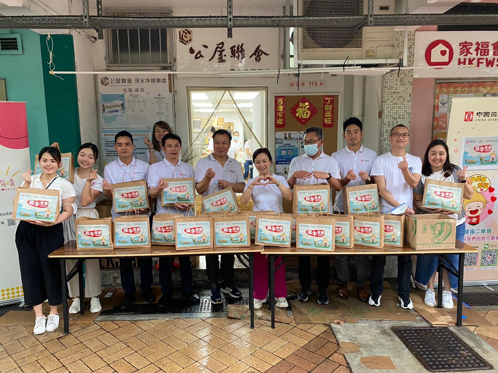 立法會議員、中國海外愛心基金會董事陳凱欣(右五)與中國海外集團義工在黃色暴雨 警告下到深水埗麗閣邨向 800 名長者派發愛心粽及食品包。
