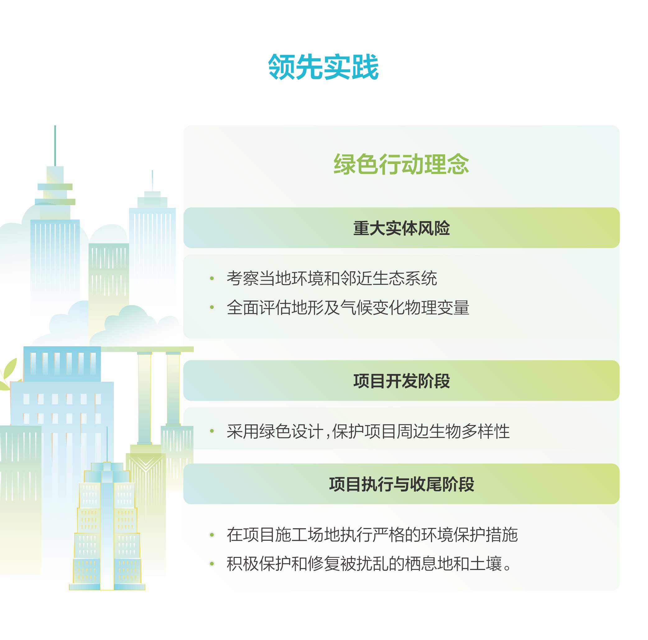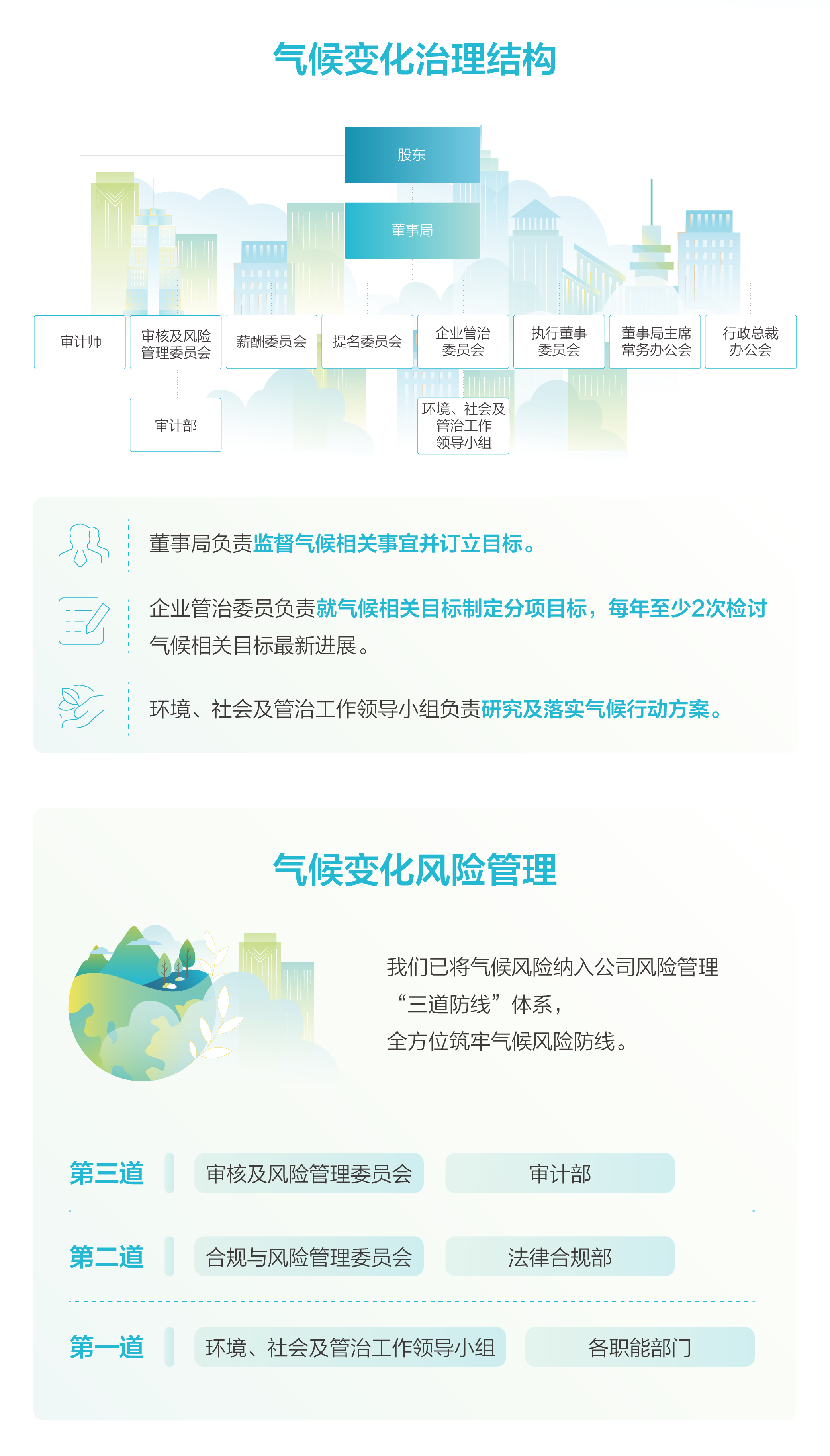 從2020年起,中國海外發展依據氣候相關財務資訊披露工作組(TCFD)的建議框架,圍繞「治理」「策略」「風險管理」以及「指標和目標」四大核心支柱,係統構建氣候風險管理機製,以專業行動積極應對全球氣候挑戰。公司持續跟蹤國際氣候披露準則、全球市場趨勢及本地監管要求,定期評估氣候變化管理成效。通過「三道防線」機製監測和協調風險管理,並開展氣候變化情景分析,識別實體風險與轉型風險,評估其對業務的潛在影響,進而製定涵蓋緩解、控製、轉移及接受四類策略的氣候適應措施。