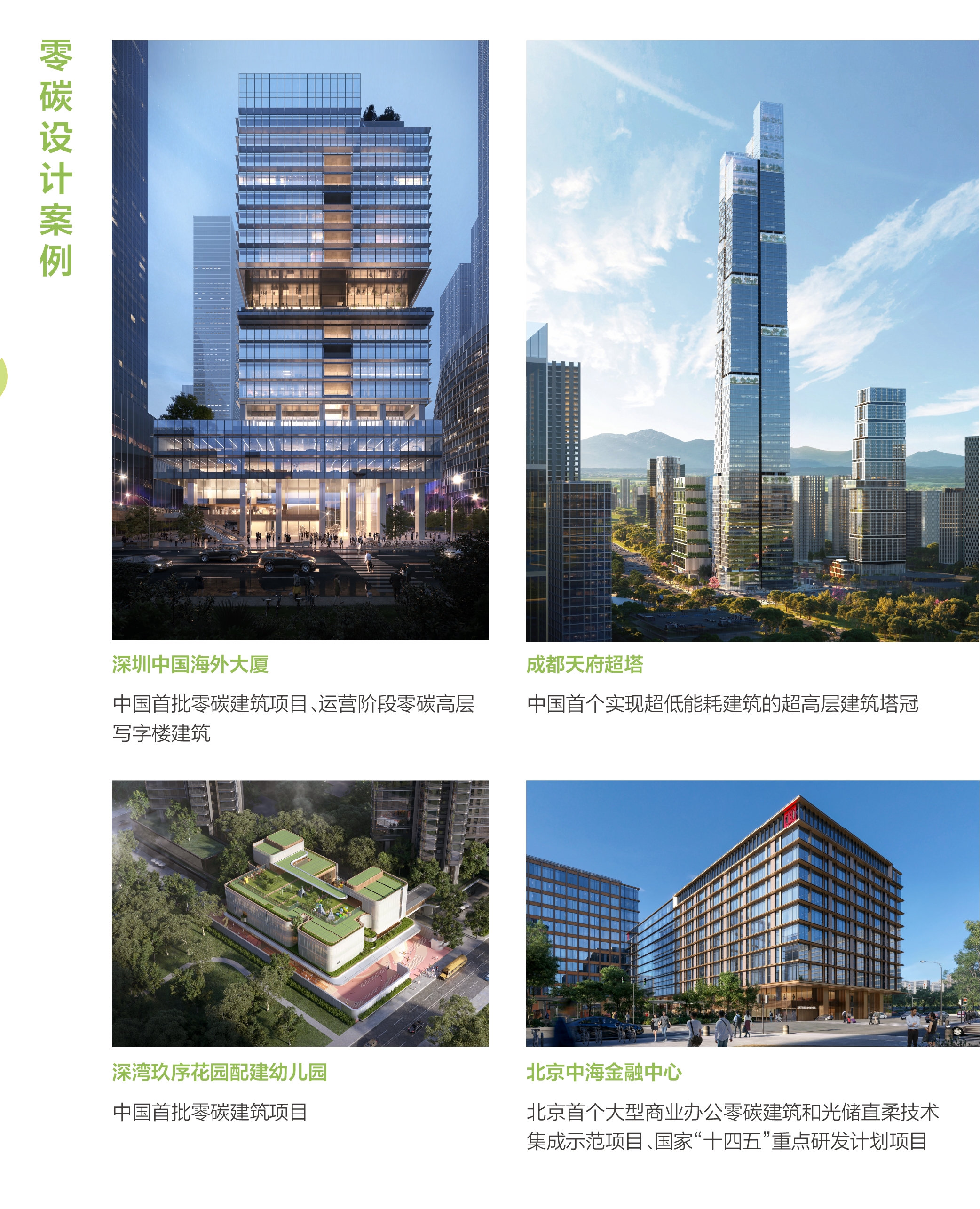 在實踐層麵,中國海外發展將綠色理念貫穿項目全生命週期,從選址、設計到建造均採用綠色設計。公司重點打造零碳建築標杆項目,包括:中國首個5A級零碳高層寫字樓(深圳中國海外大廈)、零碳兼零能耗建築(深灣玖序花園配建幼稚園)以及北京首個大型商業辦公零碳建築(北京中海金融中心)。其中,北京中海金融中心獲批「十四五」國家重點研發計畫專案「零碳建築控製指標及關鍵技術研究與應用」科技示範工程。