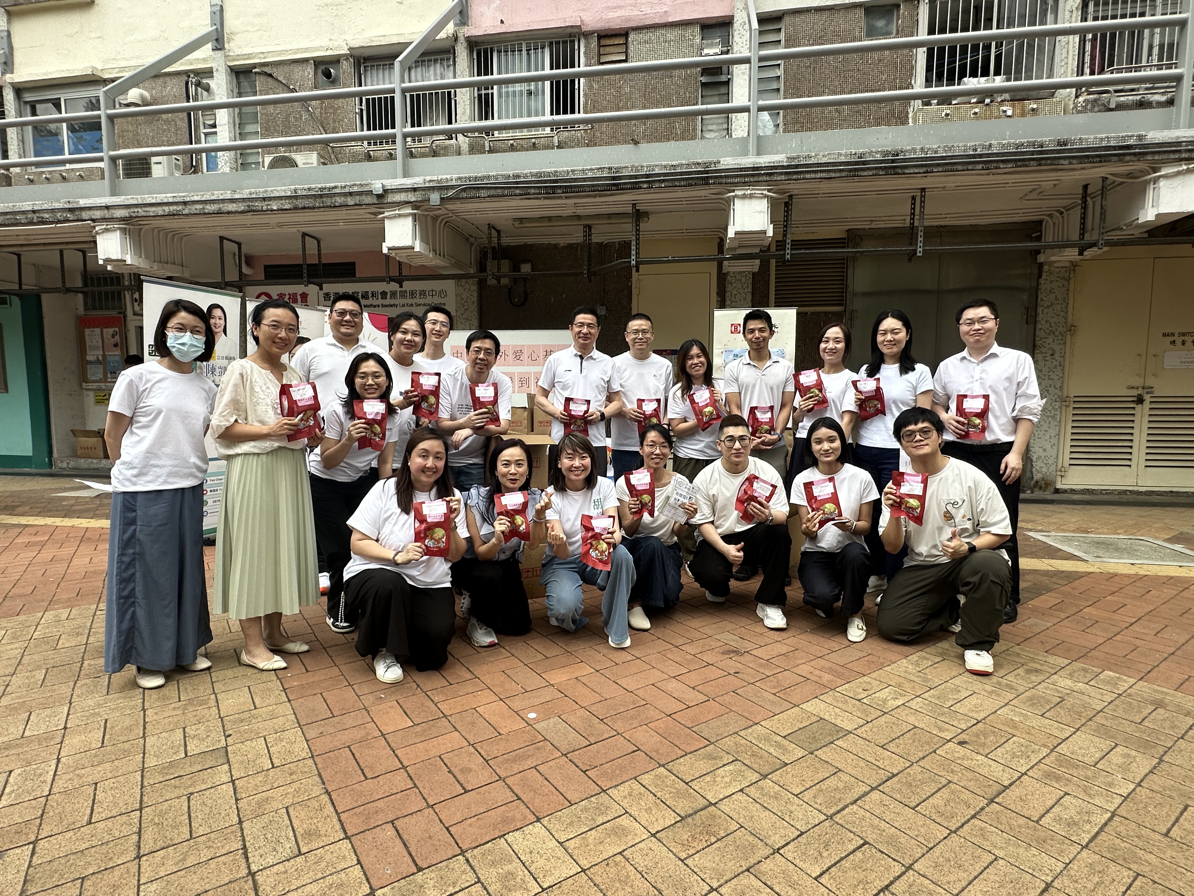 中國海外集團副總經理、中國海外愛心基金會董事巢剛(左九),立法會議員、中國海外愛心基金會董事陳凱欣(左十)與中國海外集團義工到深水埗麗閣邨向基層長者派發端午愛心粽。