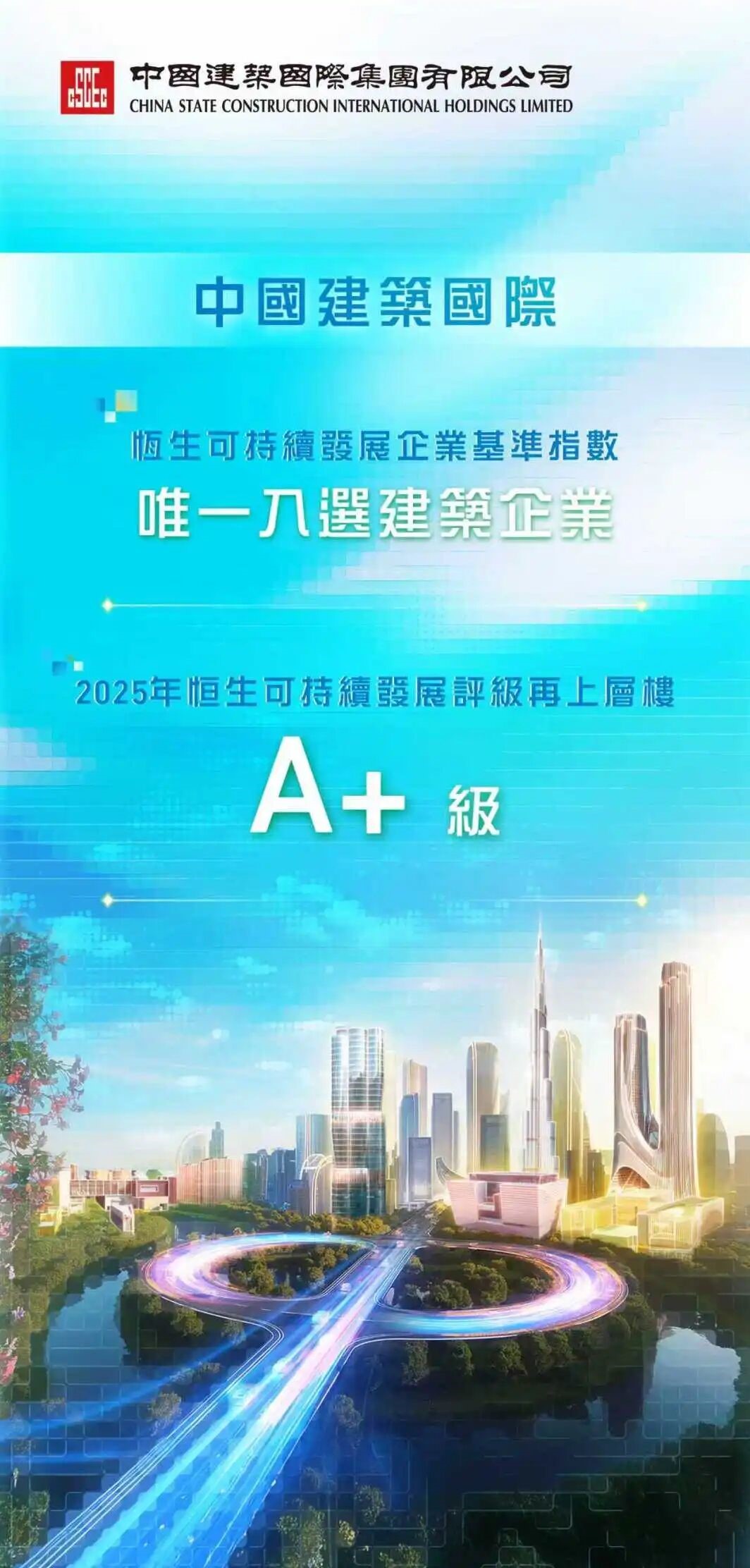 近日,恒生指數公司發布2025年上市公司可持續發展評級結果。中海集團旗下中國建築國際集團有限公司憑借ESG(環境、社會及治理)方麵的良好表現,評級由A上調至A+,再度入選恒生可持續發展企業基準指數(簡稱HSSUSB)——再度成為唯一入選的建築企業。