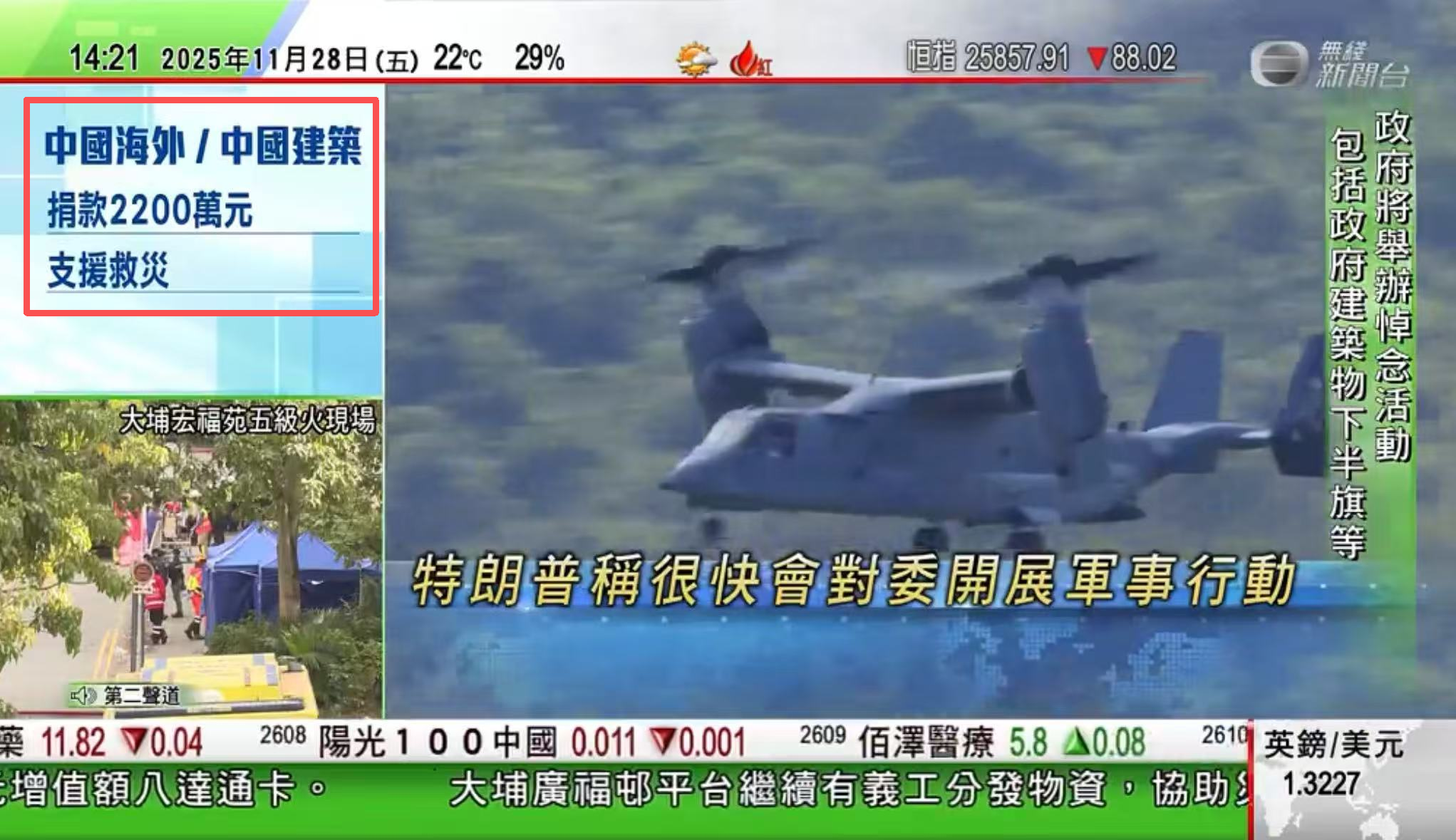 11月28日,中國海外/中國建築宣布,公司捐款2000萬港元、員工個人首批捐款208.06萬港元,支持香港大埔宏福苑火災救援,用於應急救災和災後恢複等工作,幫助受災居民渡過難關。