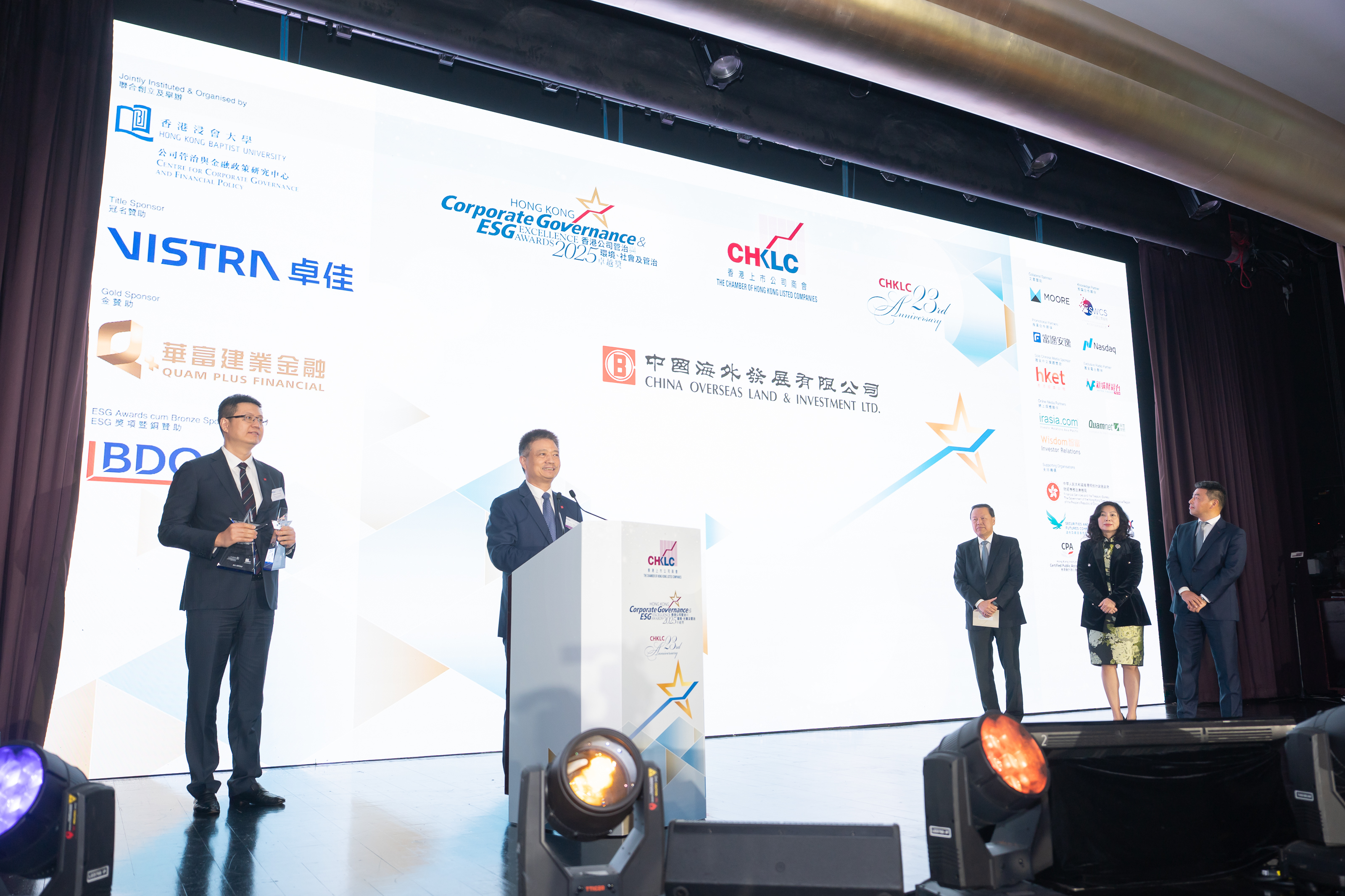 近日,由香港上市公司商會及香港浸會大學公司聯合評選的2025年度“香港公司管治與環境、社會及管治(ESG)卓越獎”頒獎典禮在香港舉行,中國海外發展榮獲恒生指數成分股公司類別“ESG卓越獎”和“公司管治卓越獎”,這是公司首次同時獲得這兩個殊榮,並繼續成為恒生指數成分股中唯一獲得上述殊榮的內房企。中海集團董事長、中國海外發展董事局主席顏建國,中海集團董事、中國海外發展行政總裁張智超出席活動。