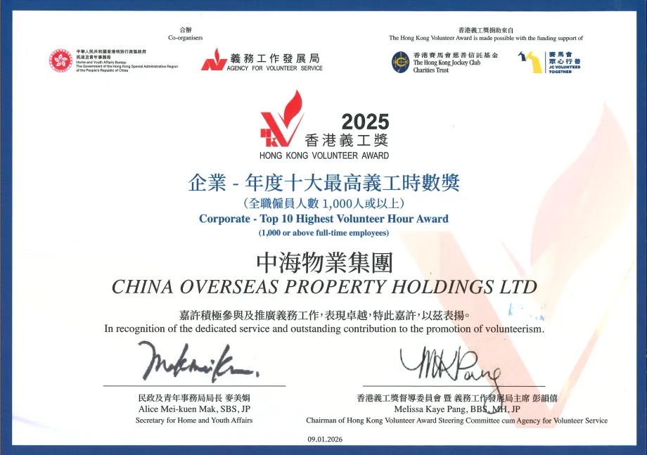 中海物業集團獲得“企業-年度十大最高義工時數獎(全職雇員人數1,000人或以上)”、“企業-義工時數卓越金獎”;旗下美博工程獲得“企業-年度十大最高義工時數獎(全職雇員人數100-999人)”、“企業-義工時數優異獎”。