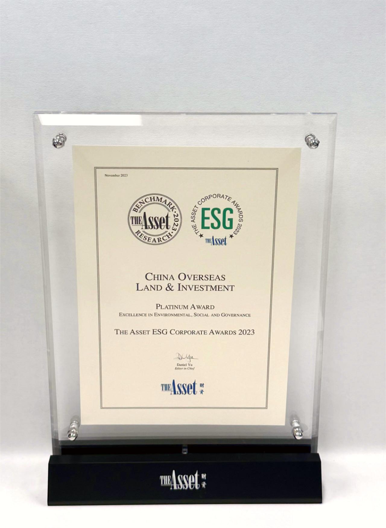 中國海外發展有限公司(「本公司」或「中國海外發展」;股分代號:0688.HK)欣然宣布再度榮獲由亞洲權威財經雜誌《財資》頒發的「2023年ESG企業大獎」,是本公司連續第八年獲得嘉許。今年中國海外發展蟬聯「鉑金獎」,表彰本公司在財務業績、企業管治、社會責任、環境保護、投資者關係、信息披露及企業傳播等範疇的卓越表現。