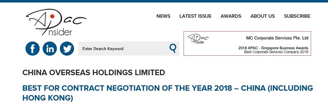 9月21日,中國海外集團基於在合約談判方麵的優異表現,獲得 《APAC Insider》頒發的APAC Insider Legal Awards 2018“最佳合約談判-中國區(含香港)”獎,是繼2015年首次獲獎後連續第四年獲此殊榮。該獎項對中國海外集團在法治建設工作方麵取得的成績再次給予肯定。